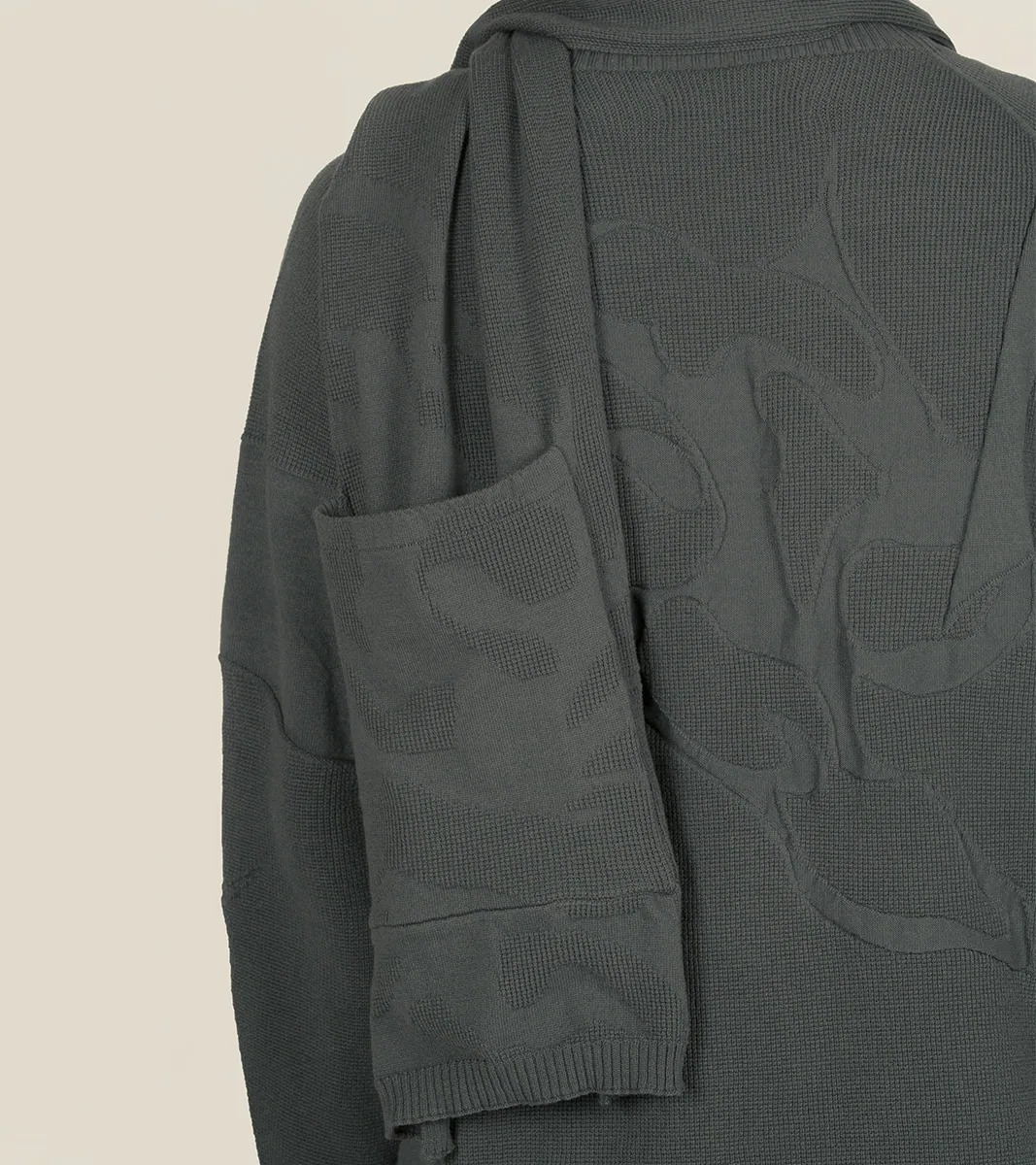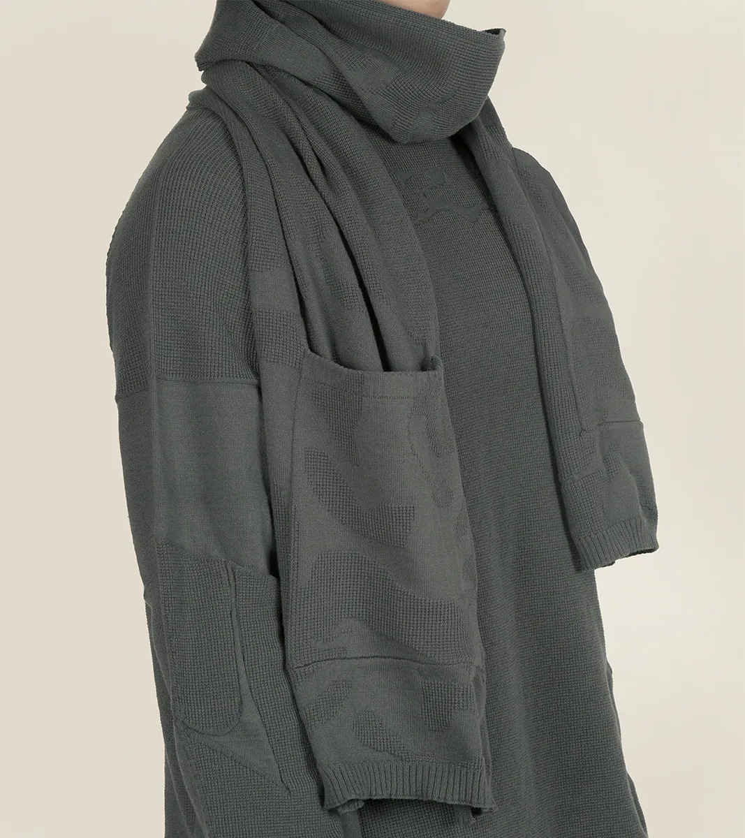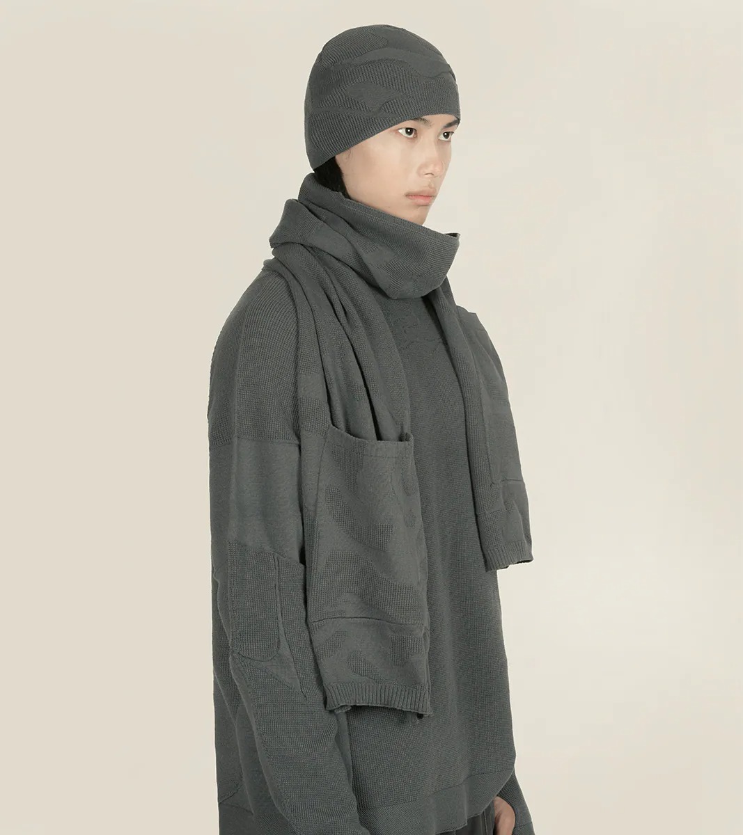 圍巾採用 Seawool® 海洋回收紗線織造,帶來輕薄的巾身與羊毛般的柔軟觸感。面料結合季度圖像針織結構,讓豐富而低調的紋理穿插其中,營造出獨特的科技感與風格。