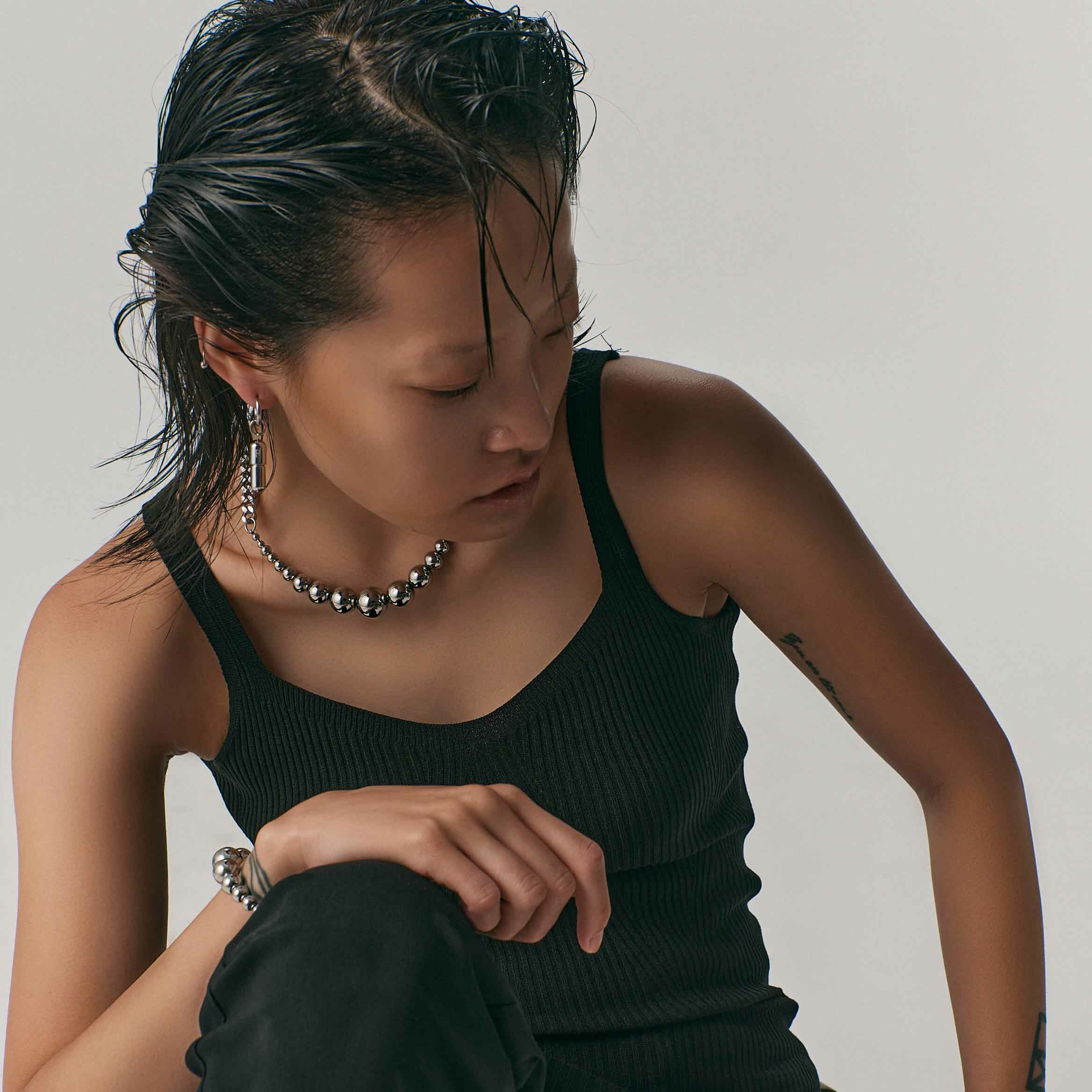 • 輔料扣具經噴砂處裡,表層的霧化呈現與柔滑手感無可取代,鋼質鍊條與球體結合,貫穿系列主軸。