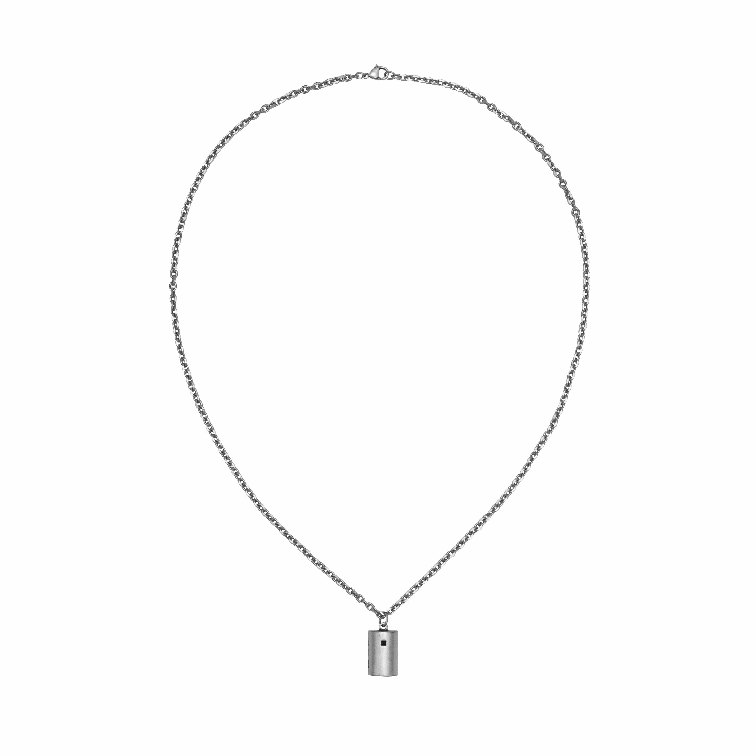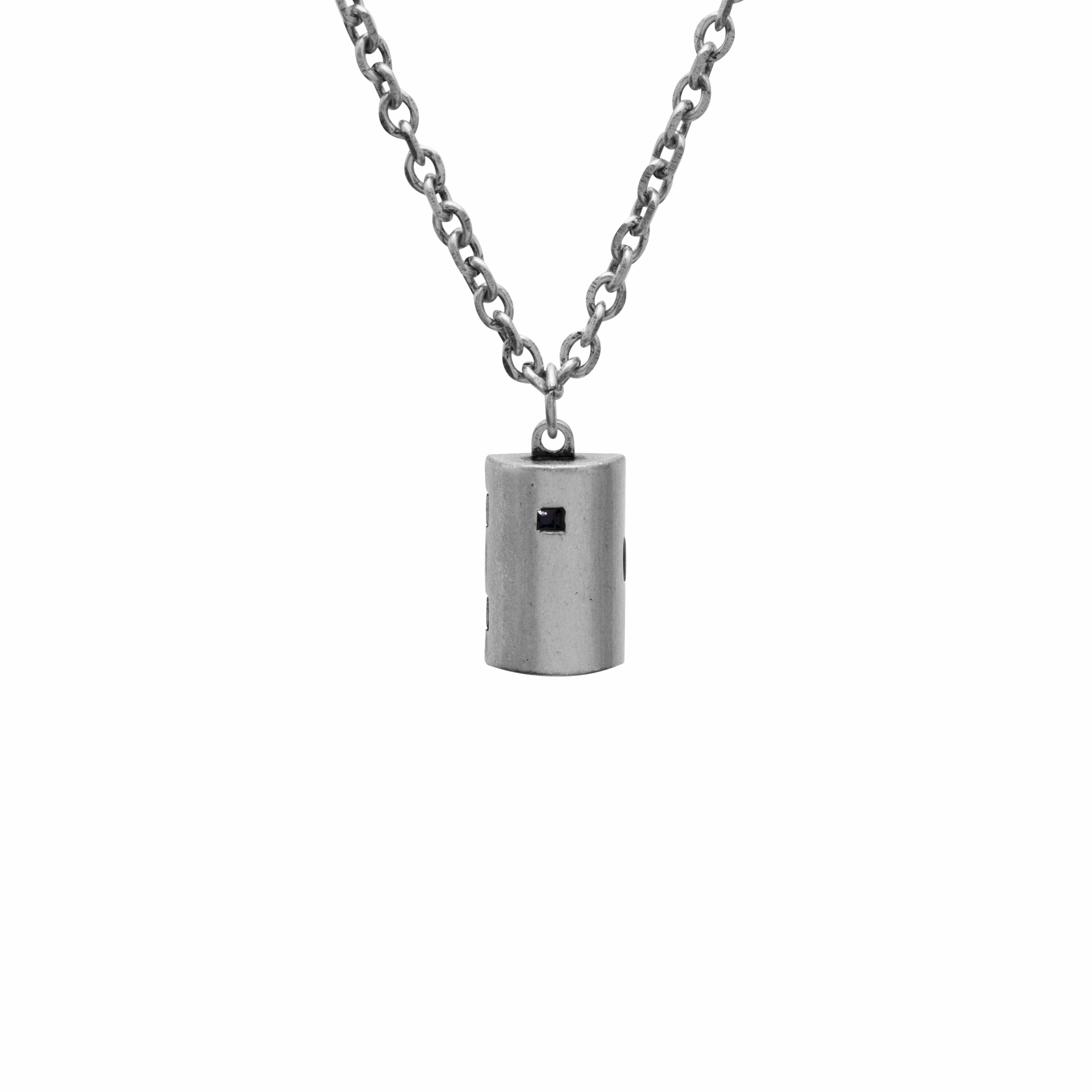 • 以覆蓋完整核電廠的「石棺」本體為雛型,結合磁吸式掀蓋設計,表層以藍色鋯石作為精簡點綴,背後刻上車諾比紀念碑文,是一款簡約並極富致敬意味的結構墜飾項鍊。