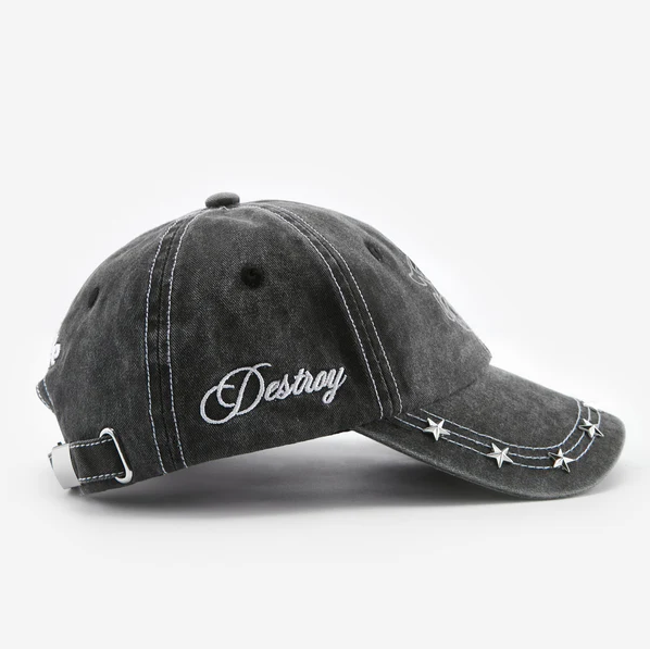 This washed cotton 6-panel baseball cap features a convenient snapback closure, complemented by white stitching and star-shaped metal studs on the brim.